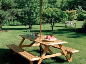 - Wheelchair-accessible teak picnic table features extended tabletop. Easily seat up to eight people with built-in benches, or add chairs to seat 10. Teak-capped umbrella hole fits poles up to 2-3/8 in. in diameter. Our refined version of the classic picnic table features a slatted tabletop and rounded corners. Extended top creates a 20 in. deep by 27-3/4 in. high clearance…