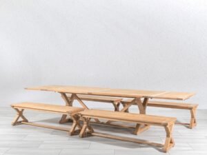 - Ample dining space for eight to 12 people; optional end extension leaves sold separately. Simple, timelessly designed teak farmhouse table for refined outdoor spaces. X-shaped legs complement modern farmhouse and traditional aesthetics. Pair with our 8 ft. backless bench for practical, extended seating.